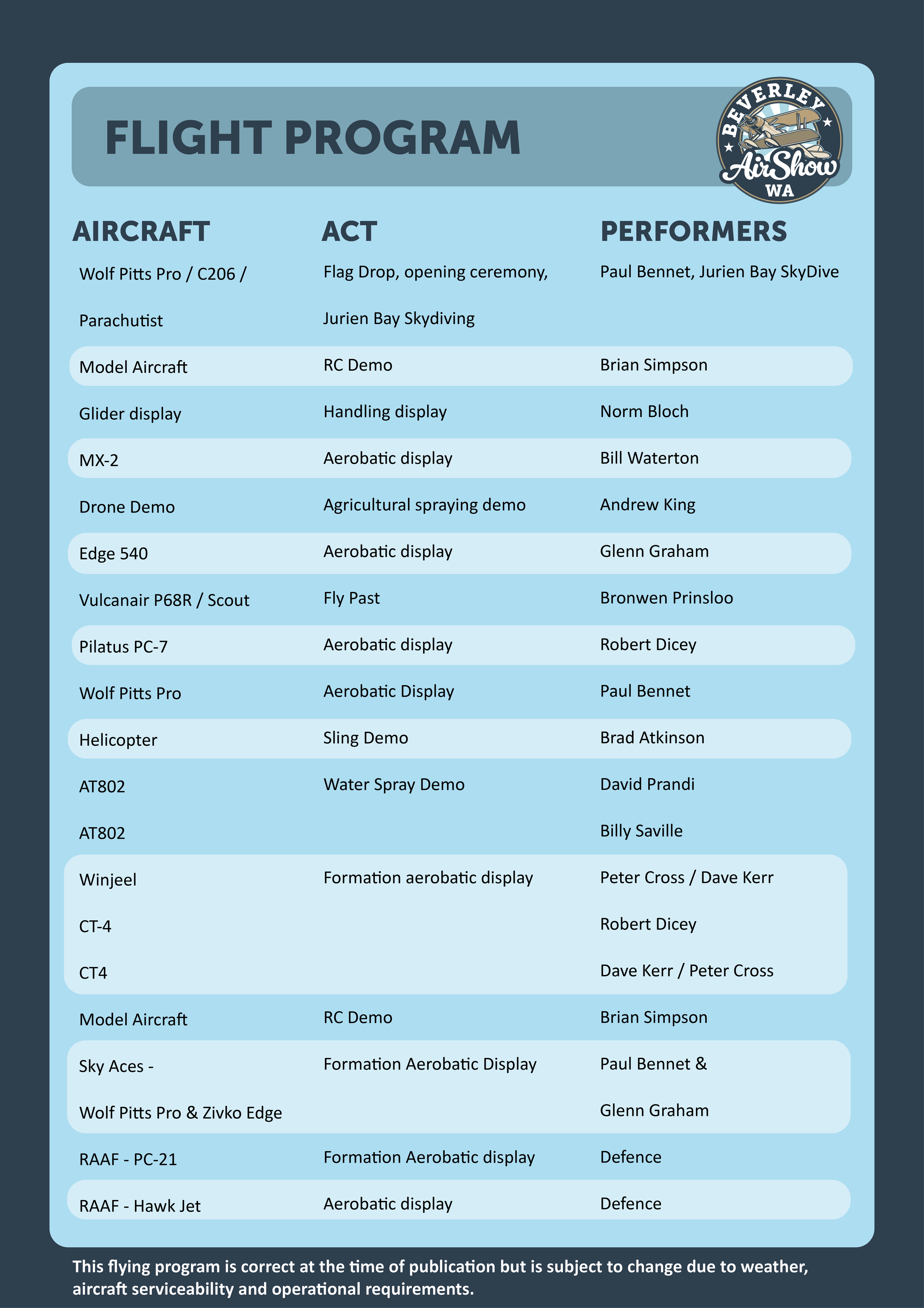 Aircraft will be added as they are confirmed. Due to the nature of flying displays, performing aircraft are subject to availability and maintenance requirements.